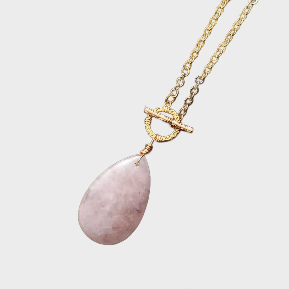 אלגנטיות רכה עם נוכחות טבעית: תליון טיפה גדול מקוורץ ורוד משתלשל משרשרת חוליות מוזהבת עם סגר T דקורטיבי מלפנים. צבעו העדין מעניק טאץ’ נשי ומואר — מושלם ליום־יום, למסיבה או כמתנה עם אמירה.