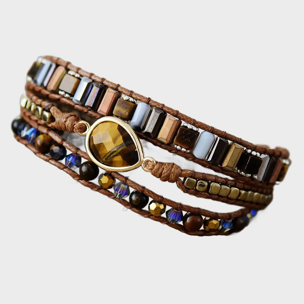 צמיד בוהו עוטף ומשדרג כל לוק: שלוש שכבות חרוזים ואבנים מלוטשות עם אבן מרכזית בצורת טיפה מעין־הנמר במסגרת מוזהבת. תערובת גוונים חמה של זהב, חום וכחול עמוק מעניקה נוכחות נעימה ואנרגיה מאזנת—ליום־יום, למסיבה או כמתנה עם משמעות.