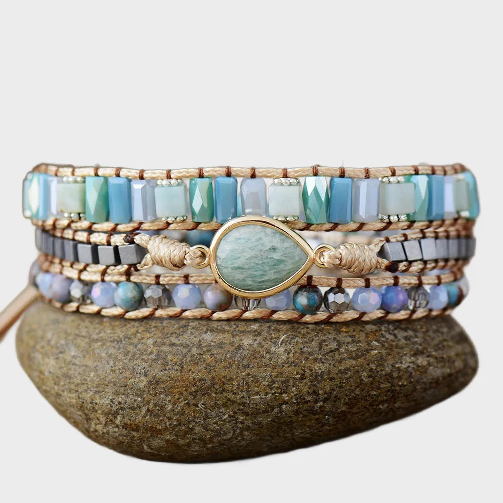 צמיד מעטפת (Wrap Bracelet) המשלב סטייל פראי עם רוך. במרכז הצמיד עומדת אבן "עין הנמר" (Tiger Eye), הידועה כאבן המעניקה אומץ, הגנה ומיקוד, כשהיא עטופה ברצועות שזירות למראה שכבות טרנדי שמשדרג כל הופעה.